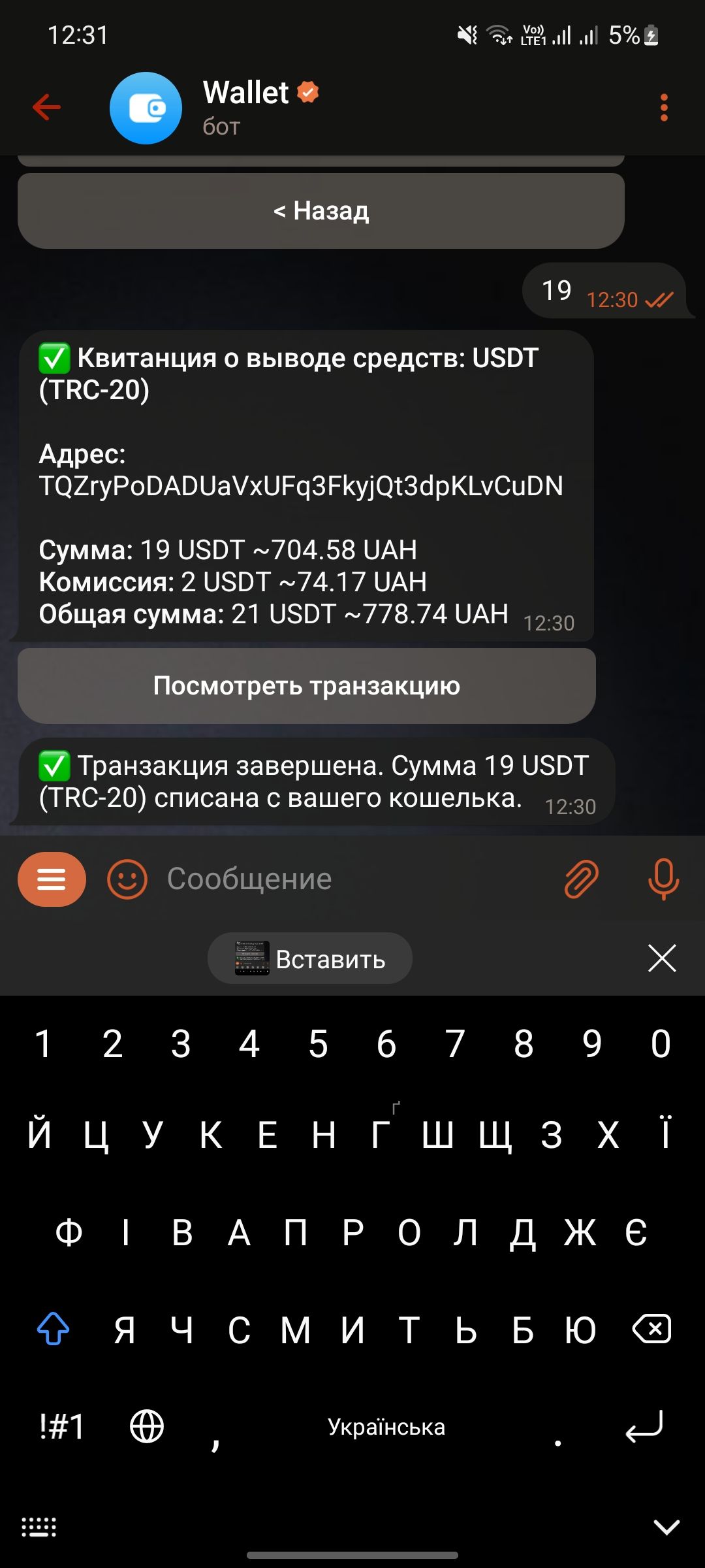 Тариф просветленный (1500), перевел 19 usdt 18:50