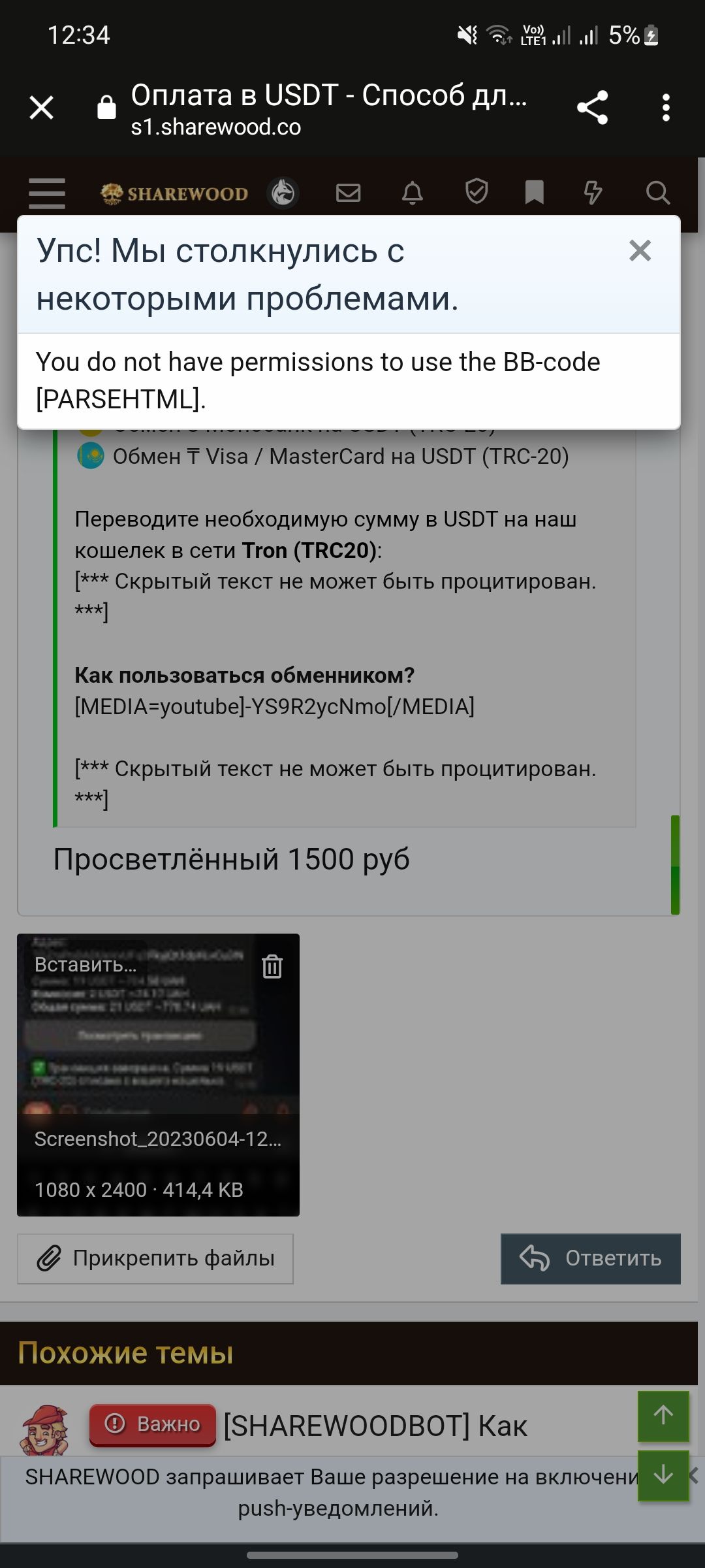 Оплатил доступ на просветлёный 1500 руб на ваш адрес usdt trc20 в 12.30 по МСК. Когда подключат
